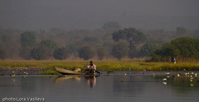 We decided to go around the area with a motorcycle on dirt roads. The very first minutes we managed to hit one store with gasoline in glass bottles. We both fell down, but luckily the bottles with the precious liquid remained. With a few scratches and lots of laughter we left the accident. We drove over 550 km with the small motorcycle on the dusty roads and even we got stopped by the police in Gaoua in the lobby country. We ate a lot of dust and got very tired of the constant driving through the potholes and sand. We returned the bike with great joy and decided to continue walking toward the Lake Tangrela - 8 km from Banfora. We slept along the lake, rode on a boat and we saw hippos, birds and hundreds of beautiful lilies. The camping on the lake was just 1,50 Euro for both.