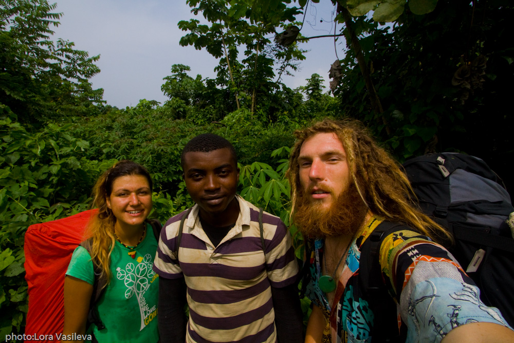 On the second day we reached summit. We were high above the clouds and the sun was smiling at us - something not so typical for this mountain. At the top was terribly cold and windy, but even there was still grass and vegetation. We descended at the other side of the mountain through rivers of cold lava. The steep slope, studded with small black stones was quite slippery and we started lava-boarding down for the faster moving and more fun. We ran down turning left and right, falling down and getting up to continue again. We walked for 10 hours, we saw the craters of 1999 eruptions and in the evening we arrived at the Man Spring - the last shelter and water point on the way. We rested there happily as we thought that the toughest part of the trekking is over. The next day, however we had 10 hours descending through the thick jungle, which proved more difficult than climbing to the top. We walked on in the wet ground in small, overgrown path made by poachers. The last tourists passed from here 3 months ago and in some places the trail disappeared, swallowed up by jungle, and Fritz had to make the way with his machete. Walking was slow because of the many obstacles – fallen trees, high vegetation and slippery mud. Our feet were totally wet only after the first hour walking through the wet grass, and in the evening they looked like large mushrooms. We were supposed to see forest elephants and chimpanzees, but we only saw fresh elephant dung. Fritz told us we should arrive at 16.00, but at 17.00 we were still walking through the dark forest that looked endless. “Are we close"- we asked more and more often. "No, we are far” - Fritz answered each time. Just when we thought to stop somewhere to sleep, it started raining heavily. There was no where to hide and we decided to walk until dark. We had many blisters on the feet from the 3-day walk and we were all over wet. The path became even more slippery and we were falling in the mud very often. Here in the rain no shoes can save you. Finally we got to the sleeping point around 19 o’clock and it turned out that there's nothing there. Just a small space in the bamboo forest. Not even a shed to hide from the rain. The forest was quite wild. Because of lack of water and difficult access (the nearest road is 8 hours descent) there were no people. The rain continued in full force and Fritz was trying to make a fire. He stood in the rain without a jacket and did not even had where to sit. Fortunately he made the fire and soon it stopped raining. We gave Fritz gave a survival foil, which protects from moisture and cold and a jacket and told him if there is rain to come to our tent. We survived the night and morning, 08.04, Lora's birthday, the sun smiled at us again. After a long struggle we managed to light a fire with wet bamboos and dried our clothes and shoes. Today we had to get to the ocean and we were already dreaming about the warm beach.